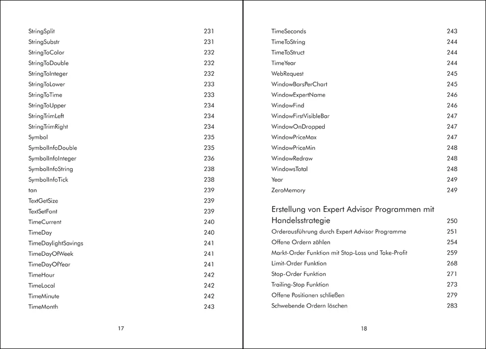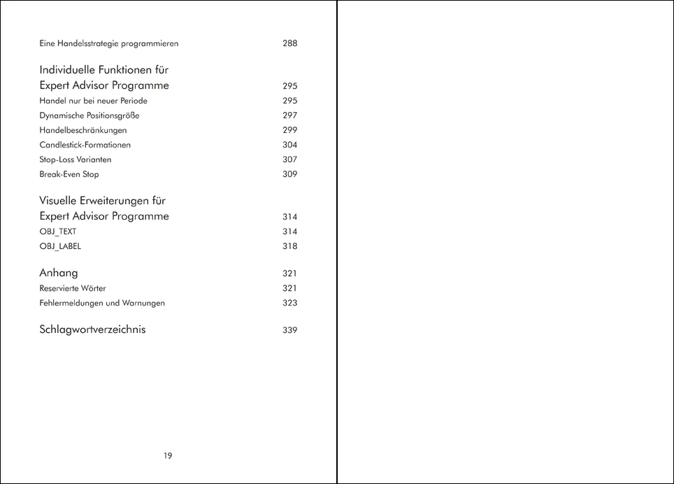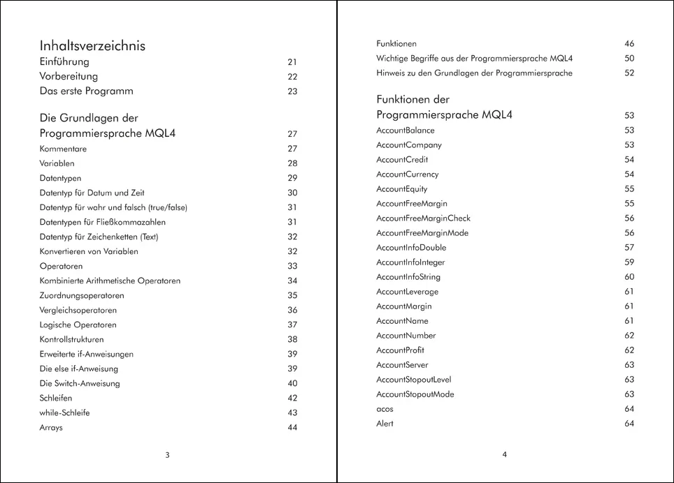 Im ersten Kapitel werden die Grundlagen der Programmiersprache MQL4 vermittelt. Der Leser erlernt die Bedeutung von Variablen, Datentypen, Operatoren, Kontrollstrukturen, Schleifen, Arrays und Funktionen.
